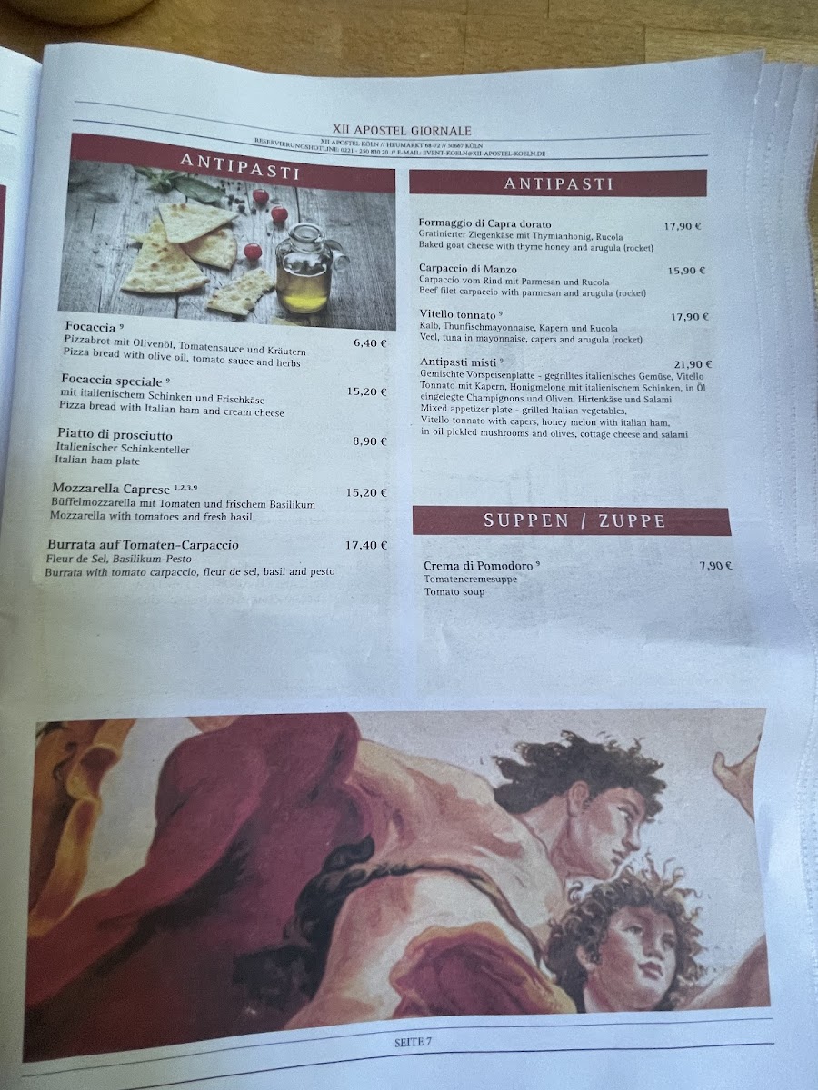 Welcome to XII Apostel Koln, a delightful Italian restaurant nestled in the heart of Cologne at Heumarkt 68-72. This charming spot offers a diverse menu that caters to every palate, from classic pasta dishes like Spaghetti Bolognese (€14.90) and Tortellini Ricotta e Spinaci al Gorgonzola (€14.90) to zesty Penne all’Arrabbiata (€13.70). The restaurant also boasts a special kids’ menu, making it a family-friendly destination.